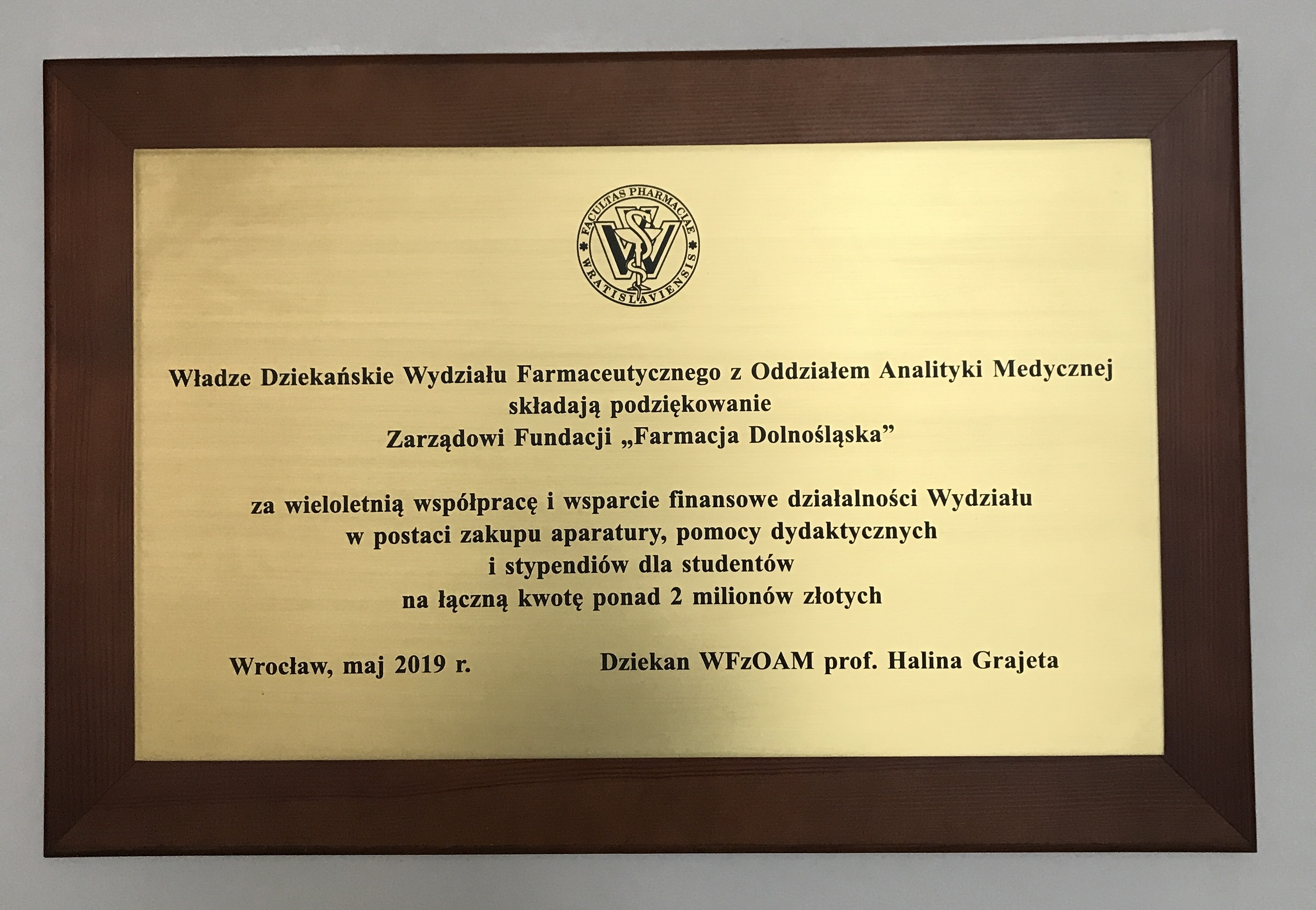 Fundacja "Farmacja Dolnośląska" w latach 2017 - 2018 zakupiła i przekazała na własność w formie darowizny Wydziałowi Farmaceutycznemu